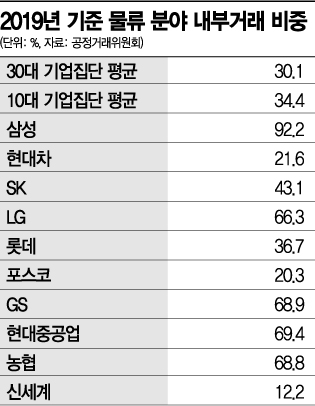 상위 10대 집단으로 좁히면 내부거래 비중은 더 높아진다. 물류는 매출액의 34.4%, SI는 67.4%가 내부거래에 의존하고 있었다. 이들 대기업 중 물류 내부거래 비중이 가장 높은 집단은 삼성이었다. 물류서비스 기업인 삼성전자로지텍은 2019년 매출 1조551억원의 92.2%인 9727억원이 그룹 내 내부거래를 통해 발생했다. 현대중공업은 상업용 탱크터미널을 운영하는 현대오일터미널의 내부거래 비중이 69.6%였다.