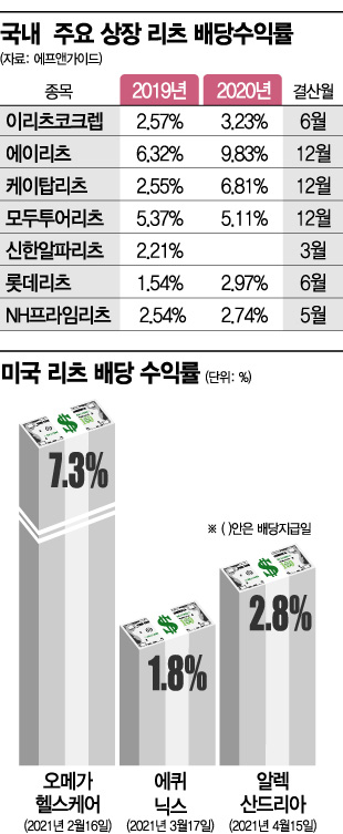 국내 상장 리츠는 현재 에이리츠와 이리츠코크렙, 케이탑리츠, 신한알파리츠, 롯데리츠, NH프라임리츠, 미래에셋맵스리츠, 이지스레지던스리츠, 제이알글로벌리츠, 코람코에너지리츠, ESR켄달스퀘어리츠 등 13개다. 이들 대부분은 연 1회나 반기 배당이다. 금융정보업체 에프앤가이드에 따르면 지난해 에이리츠(연1회 배당)의 배당수익률은 9.8%에 달했다. 케이탑리츠와 모두투어리츠는 각각 6.81%와 5.11%였다. 시가총액 최대인 롯데리츠의 경우 지난해 2차례 배당을 진행했는데 연간 배당수익률은 2.97%였다. 국내 리츠의 경우 월세처럼 매월 배당금을 챙길 수 없다.