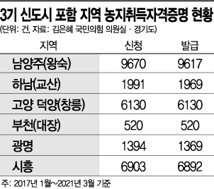 농지취득자격증명의 무차별 발급은 수도권 3기 신도시 예정지 역시 예외가 아닌 것으로 나타났다. 3기 신도시가 포함된 경기도내 5개 지방자치단체에서 지난 5년간(2017년~2021년 3월) 농지자격취득증명서 발급률 역시 100%에 가까웠다.