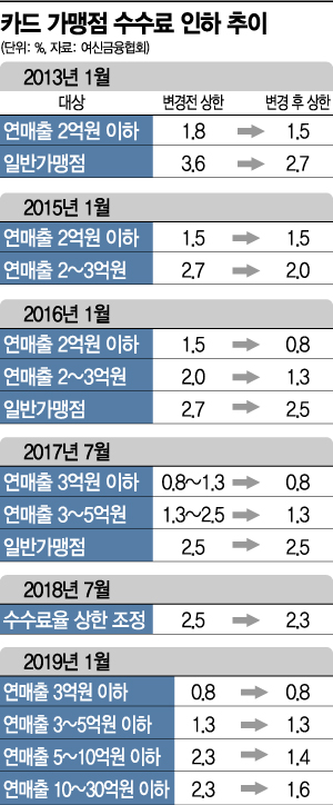 카드 가맹점 수수수료율은 2007년부터 2019년까지 12년 간 13차례 걸쳐 인하됐다. 그 결과 2007년 4.5%에 달하던 일반 가맹점 카드 수수료율은 1.97~2.04%로 절반 가까이 줄어들었다. 특히 2018년 우대가맹점 적용 범위를 5억원 이하에서 30억원 이하로 늘리면서 전체 가맹점의 96%가 0.8~1.6%의 우대수수료율을 적용받고 있다. 카드업계는 세제 혜택까지 고려하면 사실상 연매출 10억원 이하 가맹점은 수수료율이 0%대라고 설명하고 있다. 실제 연 매출 10억 원 이하 가맹점에서 발생한 신용카드 매출은 1.3% 내에서 연간 1000만원까지 세액 공제가 되기 때문에 수수료 부담이 거의 없다.