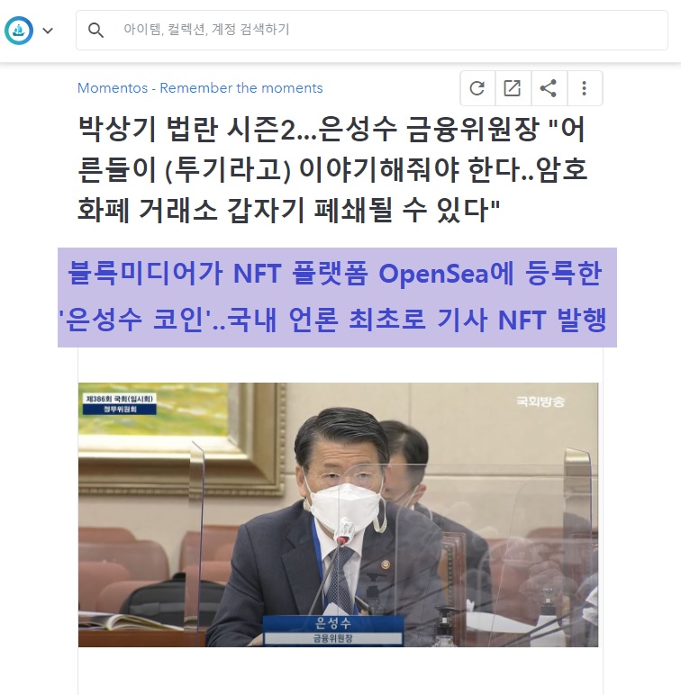 24일 업계에 따르면 블록체인 전문매체 블록미디어는 은성수 위원장의 발언이 담긴 기사를 대체불가능토큰(NFT)으로 만들었다. '은성수 코인'으로 명명된 이 NFT는 세계 NFT 플랫폼 '오픈씨'에 22일자로 등재됐다. 이후 약 270만원에 판매까지 됐다.