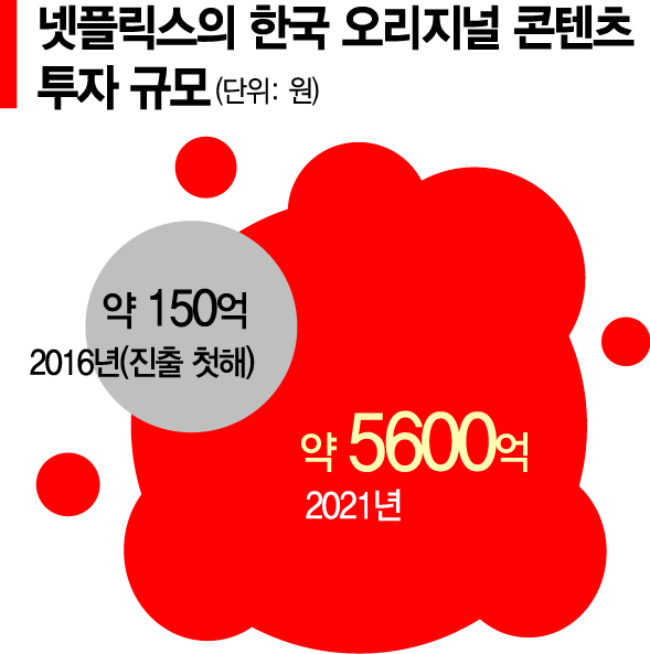 26일 관련 업계에 따르면 K콘텐츠의 인기는 넷플릭스, 디즈니플러스, 애플TV플러스 등 글로벌 OTT의 최근 행보에서도 확인된다. ‘오리지널 콘텐츠’ 전략을 펼치고 있는 넷플릭스는 일찌감치 콘텐츠 제작 중심 기지로 한국을 앞세웠다. 진출 첫해인 2016년 150억원 규모였던 한국 콘텐츠 투자 규모는 매년 늘어나 불과 5년 만에 37배 이상 확대됐다. 올해 투자 계획은 약 5600억원 규모다. 업계 관계자는 "작년까지 5년간 투자액(약 7000억원)에 육박하는 수준"이라며 "한국에 제작된 콘텐츠가 글로벌시장에서 성공할 수 있다는 확신에 따른 것"이라고 평가했다.