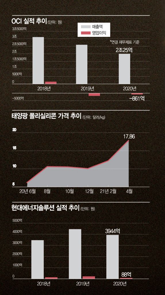 OCI는 지난해 연결기준 2조30억원의 매출과 861억원의 적자를 기록했다. 매출은 2017년 3조6000억원으로 꼭지를 찍은 이후 3년만에 1조6000억원 이상 줄어들었다. 영업이익도 2017년 2840억원 흑자에서 2019년 1806억원 적자로 전환한 이후 2년 연속 적자에서 벗어나지 못했다. 지난해 군산 공장에서의 태양광용 폴리실리콘 생산을 중단하면서 매출이 크게 줄어든 대신에 폴리실리콘 부문의 전체 적자 폭은 줄어들었다.