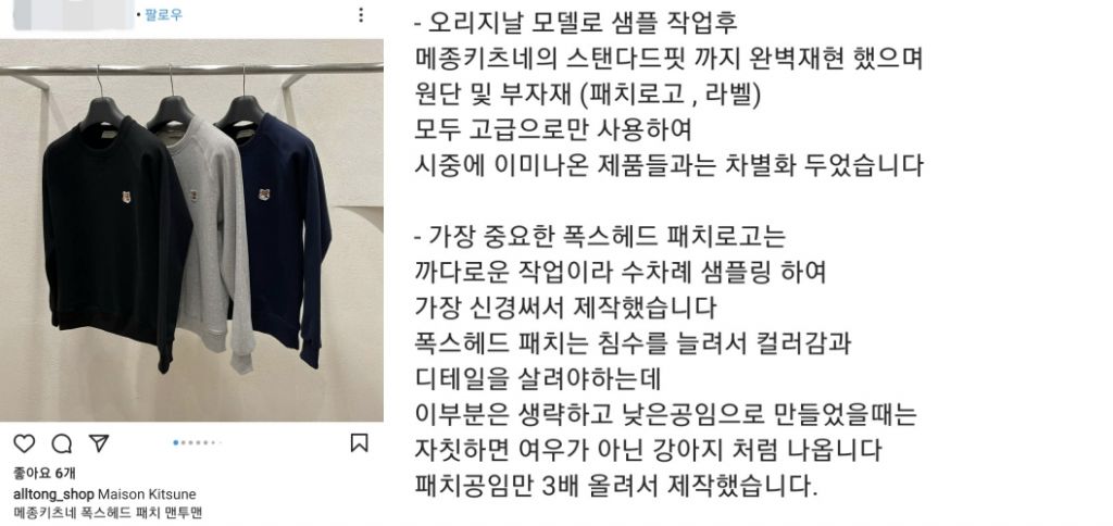 프랑스 패션브랜드 메종키츠네의 위조상품을 판매하는 인스타그램 게시물.