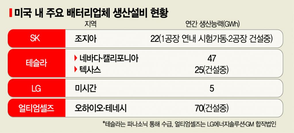 미국 내 생산거점으로 조지아주를 낙점함 SK는 현재 짓고 있는 2공장에 이어 추가 3, 4공장까지 증설하는 방안을 검토하고 나섰다. 앞서 최태원 SK그룹 회장이 조지아공장에 5조원 이상을 투자하겠다고 공언한 바 있다. 올 상반기 중 시험생산에 들어가는 1공장의 경우 연간 생산량이 9.8GWh정도며, 2공장이 완공돼 양산에 들어가면 현지 생산량은 연간 22GWh 정도로 늘어난다. SK가 향후 5년간 글로벌 배터리 생산량을 125GWh로 늘리기로 한 만큼, 중국·유럽공장과 함께 3대 축인 미국 공장이 중요한 역할을 맡았다.