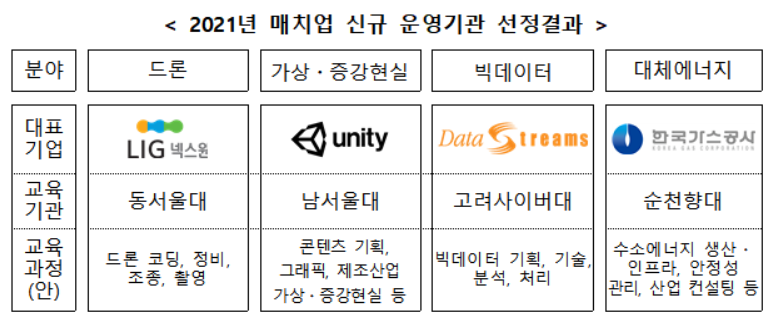 [아시아경제 한진주 기자] 신산업 분야 기업과 교육기관이 협업해 구직·재직자를 위한 단기 온라인 교육과정 '매치업 사업' 신규 운영기관에 4개 연합체가 선정됐다.