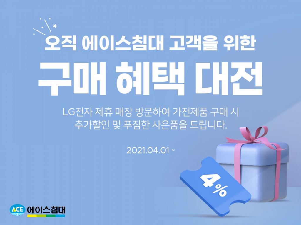 에이스침대 구매 고객은 침대 계약 시 작성했던 구매 계약서를 지참해 LG전자 제휴 매장에 방문하면 보다 합리적인 가격으로 LG전자 제품을 구매할 수 있다. LG전자 제휴 매장 중 LG베스트샵은 4% 할인, 백화점 매장은 2% 할인 혜택을 제공한다.