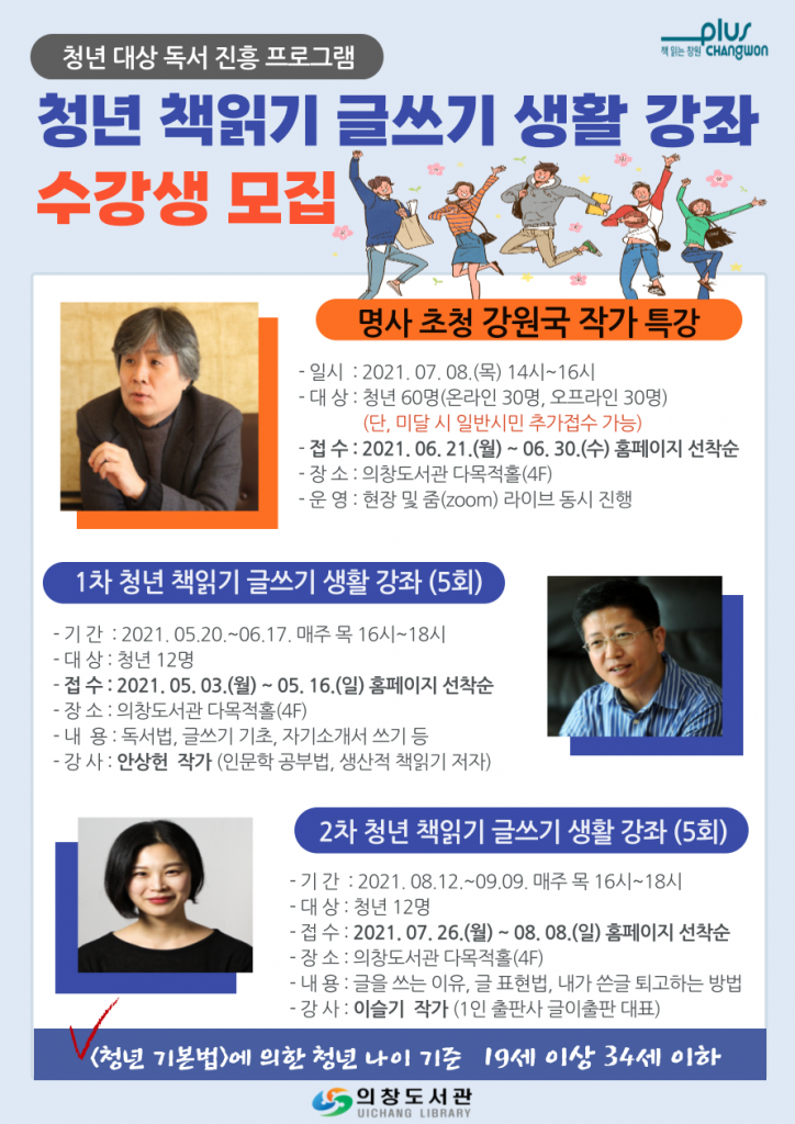 창원시 관내 19세 이상 34세 이하 청년을 대상으로 5월 20일부터 6월 17일까지 매주 목요일 오후 4시에 '인문학 공부법' 저자 안상헌 작가의 청년 책 읽기 글쓰기 강좌가 5회 열린다.