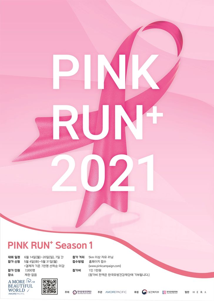 1인당 1만 원의 참가비는 한국유방건강재단을 통해 전액 저소득층 유방암 환자의 수술치료비 지원 등에 쓰일 예정이다. 2021 핑크런 플러스는 유방암 예방의 달인 10월에도 열린다.