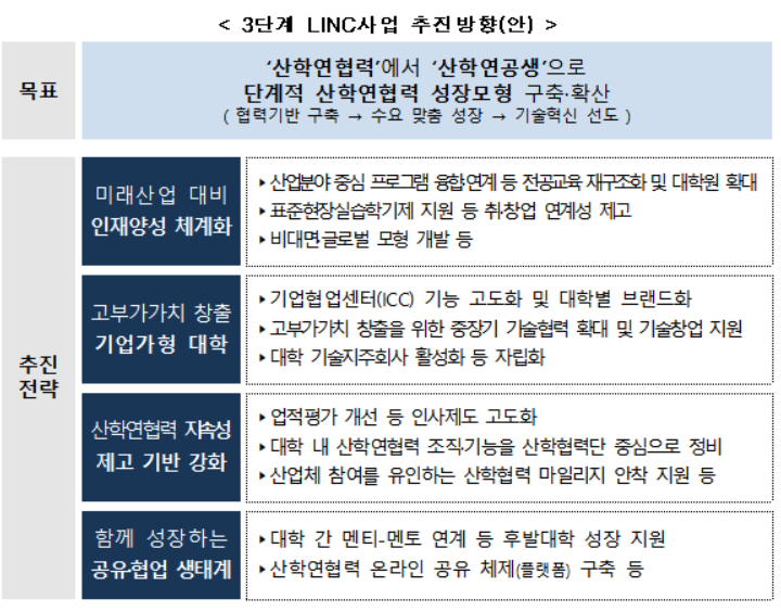 교육부는 "사업 설계부터 사업운영·관리 등 전 주기에 걸쳐 관계부처(전문기관)이 참여하는 협력 체계를 구축하여 대학 산학연협력 모델을 고도화하고 산학연의 유기적인 협력을 강화해 나갈 예정"이라고 밝혔다.
