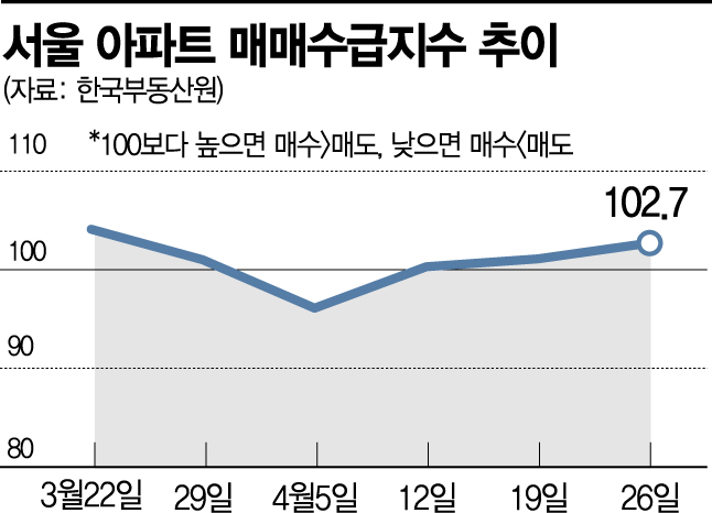 30일 한국부동산원에 따르면 이번 주(26일 조사 기준) 서울의 아파트 매매수급 지수는 102.7을 기록했다. 지난주(101.1)보다 1.6포인트 오른 것이자, 3주 연속 기준선(100)을 넘겨 상승한 것이다.