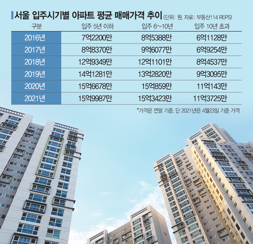 1일 부동산114가 서울 아파트의 연식별 가구당 평균 매매가격을 조사한 결과에 따르면 입주 5년 이내 신축 아파트의 평균 가격은 지난 23일 기준 15억9987만원에 달했다. 입주 6~10년과 입주 10년 초과 아파트 가격은 각각 15억3423만원, 11억3725만원으로 조사됐다.