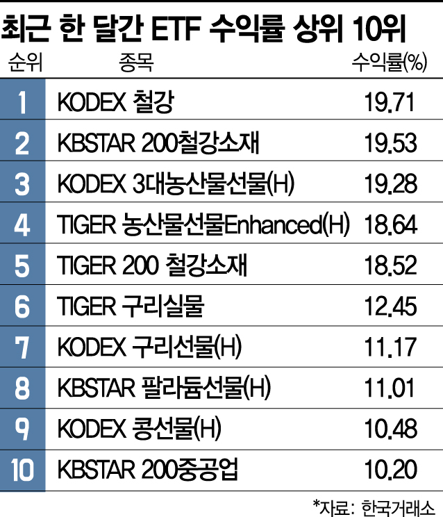 4일 한국거래소에 따르면 최근 한 달간 ETF 수익률 상위 10개 종목 중 원자재 ETF가 9개였다. KODEX 철강이 19.71%로 가장 많이 올랐고 KBSTAR 200철강소재가 19.53%로 뒤를 이었다. 이밖에 KODEX 3대농산물선물(H)(19.28%), TIGER 농산물선물Enhanced(H)(18.64%), TIGER 200 철강소재(18.52%), TIGER 구리실물(12.45%), KODEX 구리선물(H)(11.17%), KBSTAR 팔라듐선물(11.01%), KODEX 콩선물(H)(10.48%) 등이 높은 수익률을 거뒀다.