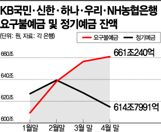 4일 은행권에 따르면 KB국민ㆍ신한ㆍ하나ㆍ우리ㆍNH농협 등 5대 시중은행의 지난달 말 기준 요구불예금 잔액은 661조240억원으로 3월 말보다 4조5400억원 불어났다. 2월에는 29조원, 3월에는 18조원 가량 증가했다. 3개월 사이 52조원 가까이 폭증한 셈이다.