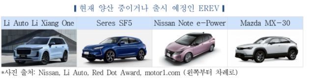 하지만 최근들어 중국·일본 완성차 기업들이 EREV에 다시 관심을 보이고 있는 상태다. 중국의 경우 리 오토(Li Auto)가 전기차 대신 EREV를 판매하고 있고, 세레스(Seres)는 IT기업 화웨이와 합작해 스포츠유틸리티차량(SUV) SF5를 EREV로 출시했다.