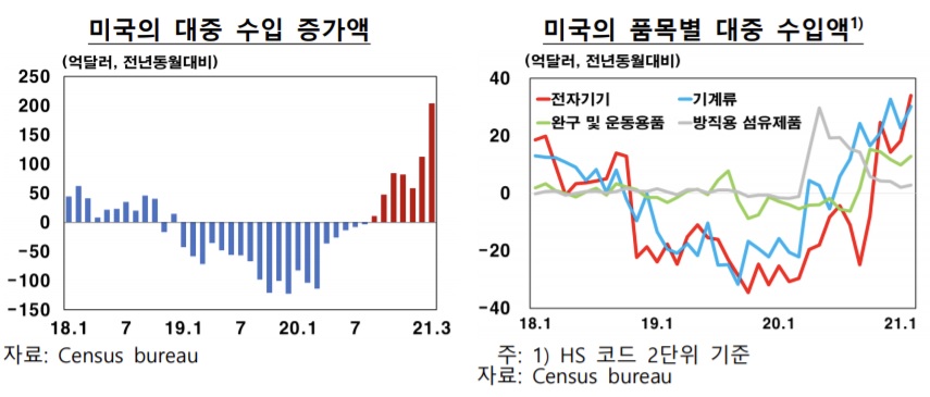 다만 "미국의 부양책 효과가 대중 수입 증가로 쏠린다면 바이든 정부가 받게 될 정치적 압박이 커질 수 있기 때문에 대중 수입 증가세가 장기간 지속되긴 어려울 전망"이라고 덧붙였다.