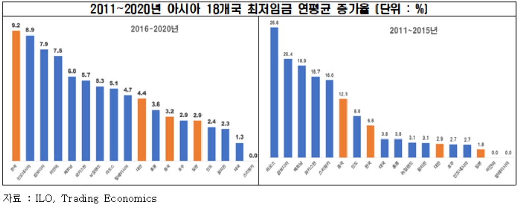 전경련은 ILO 보고서를 인용해 한국의 절대 최저임금이 2019년 기준 구매력평가지수(PPP) 기준 2096달러, 달러 환산 1498달러(약 167만원)로 아시아 18개국 중 3위라고 밝혔다. 제조업 비중이 낮은 호주와 뉴질랜드를 제외할 경우 실질적으로 1위라고 전경련은 강조했다. 전경련은 "한국 대비 국내총생산(GDP) 3.1배, 1인당 GDP 1.3배인 일본을 추월했다"면서 "2017년 현 정부 출범 이후 전개된 소득주도 성장전략에 따라 2018~2019년 10% 이상 한국의 최저임금이 인상된 결과"라고 설명했다.