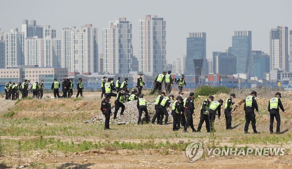 12일 오후 인천 연수구 송도신항 한 공터에서 경찰이 지난달 22일 인천 한 노래주점에서 실종된 40대 남성의 시신을 찾기 위해 수색하고 있다. [사진=연합뉴스]