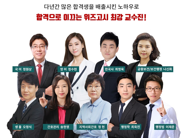 위즈고시학원은 9급 행정직, 8급간호직공무원, 9급보건직공무원, 9급 의료기술직 등 국가직/지방직 대비 전문학원 및 이러닝교육회사로, 생물 오정식, 지역사회간호 정현, 간호관리 송현영 교수진이 있는 간호직, 보건직공무원 과정과 국어 정원상, 영어 정수현, 한국사 최영욱 교수진의 행정직 교육과정을 운영하고 있다.