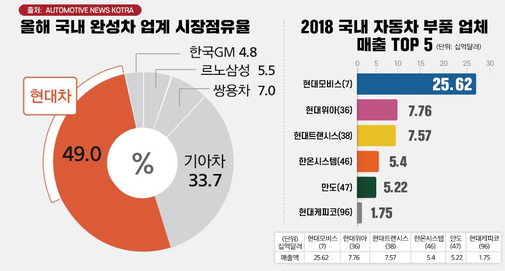 현재 국내 자동차 부품시장을 보면 현대차ㆍ기아가 수요 독점을 기반으로 부품 시장까지 장악하고 있는 형국이다. 현대모비스 등 현대차 계열사들의 부품시장 점유율은 대체부품 인증제도 도입 후에도 왜려 올라가고 있다.