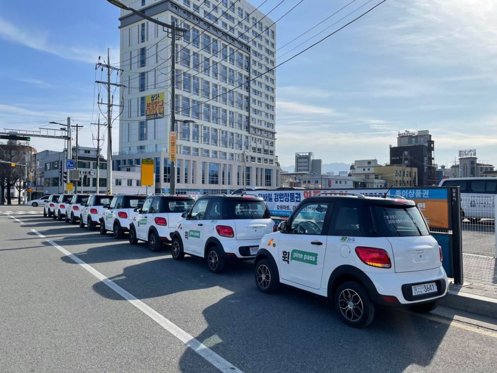 강릉 스마트시티 사업에 카쉐어링 용으로 공급된 '마이브'가 줄지어 서 있다. [사진제공=KST일렉트릭]