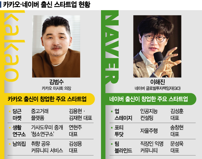 21일 IT업계에 따르면 최근 창업 생태계에서는 네이버·카카오 출신들이 승승장구하고 있다. 카카오가 내부적으로 파악한 카카오 출신들이 창업한 스타트업만 17개에 달한다. 네이버 출신 스타트업 창업자 역시 확인된 것만 최소 10명이다.