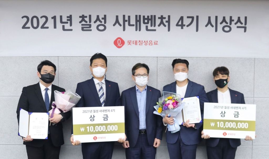 롯데칠성음료는 지난 17일 사내벤처 4기에 대한 시상식을 진행하고 ‘맞춤형 와인 정기구독 및 와인 원산지와 연계한 여행 커뮤니티 서비스’와 ‘케그(생맥주를 뽑을 수 있는 대용량 맥주통)와 이를 활용한 가정용 맥주 기계의 개발 및 판매’에 대한 아이디어를 발표한 2개팀을 최종 선발하고 팀당 1000만원의 상금을 전달했다.