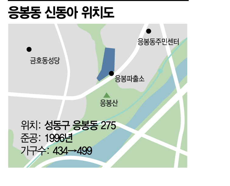 성동구에서는 응봉신동아 아파트가 리모델링 사업 추진에 속도를 높이고 있다. 이 단지는 지난 6일 성동구청으로부터 정식 리모델링 조합설립을 인가 받았다. 응봉신동아는 15층짜리 4개동 434가구로 1996년에 지어진 단지다. 수도권 전철 경의중앙선 응봉역에서 직선거리 약 300m에 위치해있으며 용적률 282%, 건폐율 26%다.