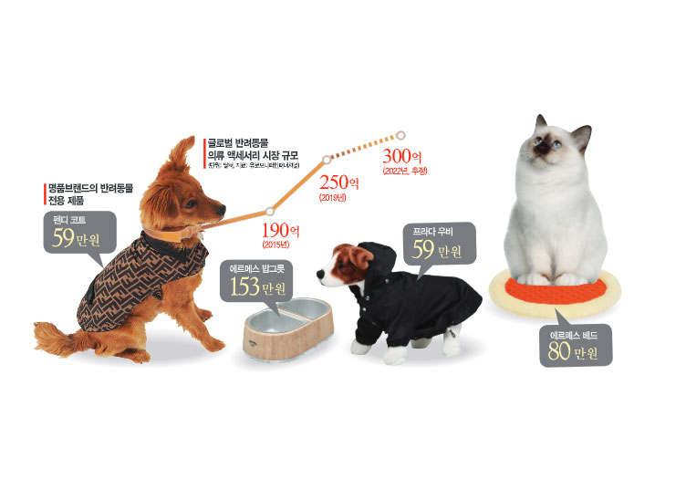 20일 명품 업계에 따르면 프라다는 이달 반려동물용 우비를 출시했다. 가격은 디자인에 따라 59만~68만원이다. 나일론 소재에 프라다 삼각 로고가 등에 부착돼 있는 디자인이 특징이다. 지난달에는 펜디가 반려견 액세서리 라인을 내놨다. 반려견 이동가방(310만원), 목줄(48만원), 코트(59만원), 목걸이(35만원) 등으로 구성됐다. 에르메스에서는 밥그릇(80만원), 바스켓(225만원), 베드(80만원) 등 다양한 용품들을 판매하고 있다. 고가 패딩으로 유명한 몽클레르도 3년 전부터 반려견용 패딩을 50만~70만원에 내놓고 있다. 반려견의 옷과 액세서리 등을 명품 브랜드 제품으로 꾸며주려면 1000만원 가까이 든다. 수량 자체가 많지 않지만 상당수 제품은 이미 품절됐다. 명품백을 구매하기 위해 백화점에 긴 줄을 늘어서듯이 명품 반려동물용품 구매를 위해 예약하고 기다리는 이도 늘고 있다.