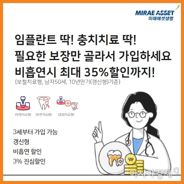 미래에셋생명은 필요한 치과 치료 보장을 선택 가입할 수 있는 '온라인 비흡연딱딱치아보험'을 출시했다고 21일 밝혔다.