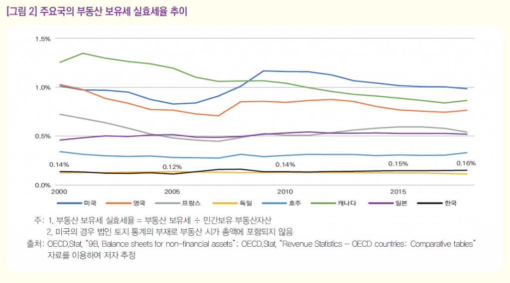 보고서에 따르면 같은 시점 기준 미국 0.99%, 영국 0.77%, 캐나다 0.87% 등 순으로 보유세 실효세율이 높은 것으로 나타났다. OECD 주요 8개 회원국 평균 0.54%였다.