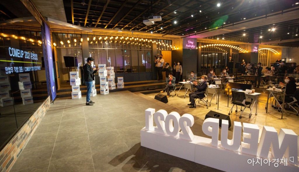 안성우 직방 대표가 26일 서울 서초구 드림플러스강남점에서 열린 '컴업 2021 조직위원회 출범식'에 참석해 조직위 운영방향에 대해 설명하고 있다./강진형 기자aymsdream@