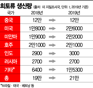 중국은 희토류 매장량과 생산량에서 세계 1위다. 전체 희토류 매장량(11946만t)의 36.8%를 갖고 있고, 전세계 생산량의 57.1%를 점유하고 있다. 가공량의 95%는 중국에서 이뤄지는 것으로 알려져 있다. 희토류가 군사 장비를 비롯해 반도체는 물론 전기차와 컴퓨터, 휴대전화, 엑스레이 등의 제조에 쓰이는 핵심 전략 물자라는 점에서 탈중국의 필요성이 커지고 있는 셈이다.
