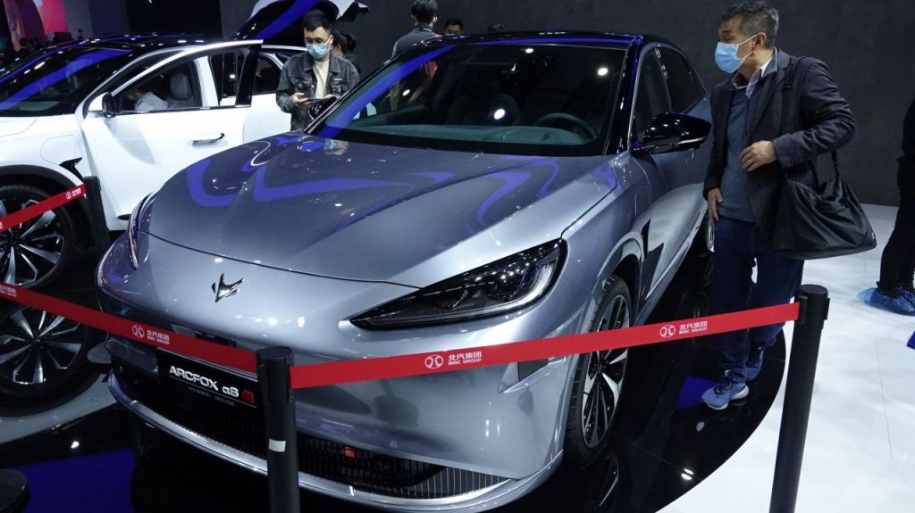 지난 4월 중국 상하이 국가회의전람센터(NECC)에서 개막한 제19회 상하이 모터쇼에 화웨이가 제작에 참여한 아크폭스(Arcfox) 알파S HBT 자율주행차가 전시돼 있다. [이미지출처=연합뉴스]