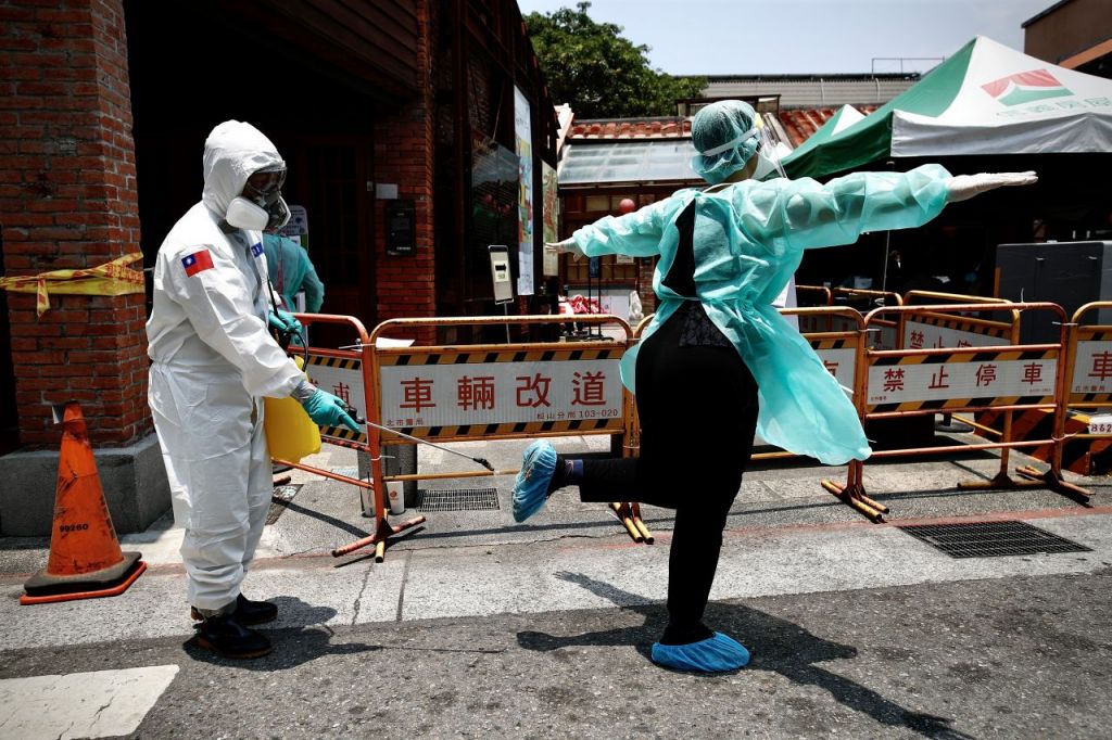 대만 수도 타이베이 거리에서 방역 관계자가 자원봉사자를 소독하고 있다.(타이베이 EPA=연합뉴스)