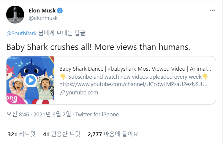 이날 일론 머스크는 이날 '아기 상어가 다 눌렀다. 사람보다 뷰가 많다(Baby Shark crushes all! More views than humans.)'고 언급하며 아기상어 영상을 리트윗했다.