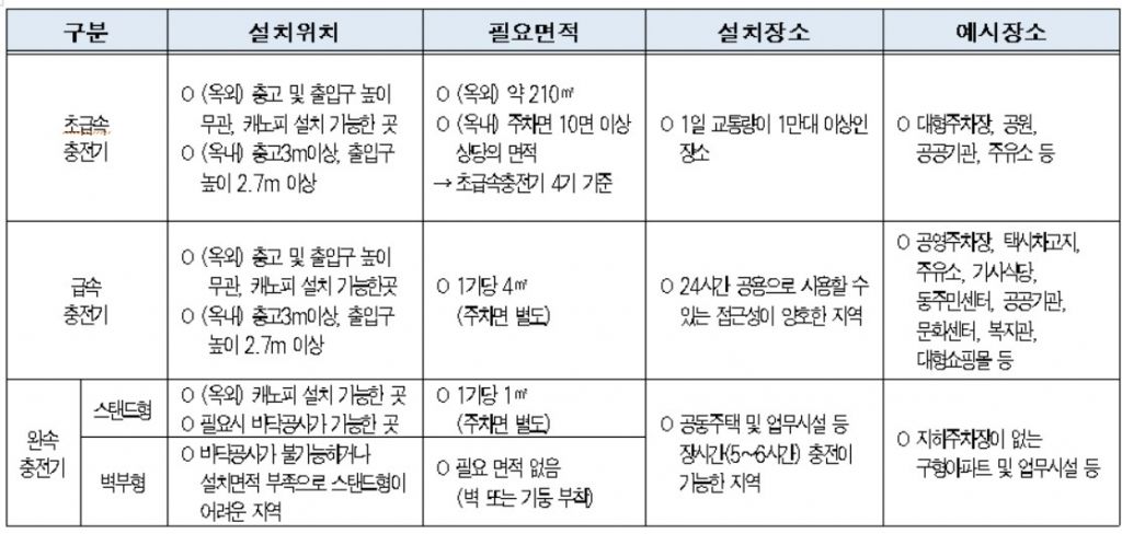 전기차 충전기에는 초급속, 급속, 완속, 과금형 콘센트 등이 있으며 이번 조사에는 초급속, 급속, 완속충전기를 중심으로 부지를 발굴할 계획이다.