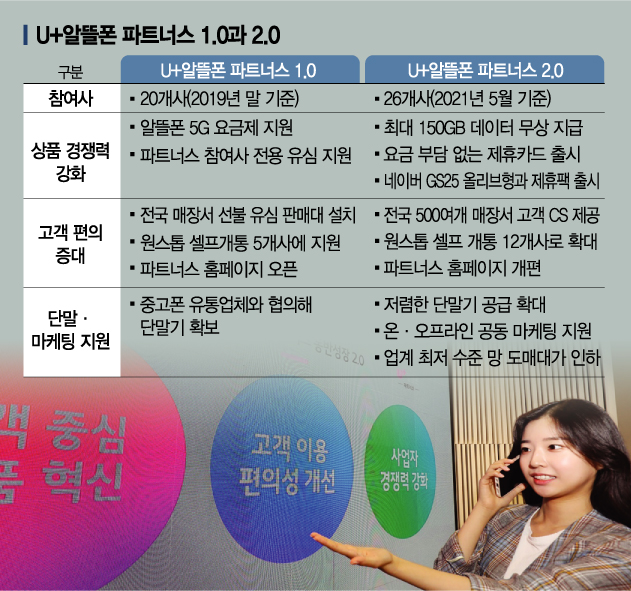 또 파트너사를 통해 알뜰폰을 개통한 고객들이 전국 LG유플러스 직영점과 소매 매장을 방문해 문의와 상담을 받을 수 있도록 고객서비스(CS)를 처리하는 매장을 기존 190여개에서 500여개로 확대하고, 추후 2000개까지 확대를 검토한다. 셀프 개통도 확대한다. 현재 파트너스 참여사 중 셀프 개통을 지원하는 알뜰폰은 5곳에 불과하지만 연내 12곳으로 확대할 계획이다. 셀프개통이 늘어나면 고객은 즉시 개통이 가능해져 편의성이 향상되고, 사업자는 인건비·물류비 등을 절감할 수 있다.