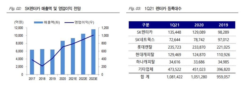 SK렌터카는 올해 2분기 연결 매출액은 2512억원으로 전년동기대비 16.5% 증가하고, 영업이익은 49% 증가한 207억원을 기록할 것으로 추정된다. 김승회 DS투자증권 연구원은 "작년 코로나19 영향으로 실적이 악화됐던 시기라는 점을 감안하면 실적 모멘텀이 부각될 전망"이라며 "올해 실적은 매출액 1조875억원, 영업이익 1019억원으로 영업이익 1000억원을 돌파하는 첫 해가 될 것"이라고 말했다.