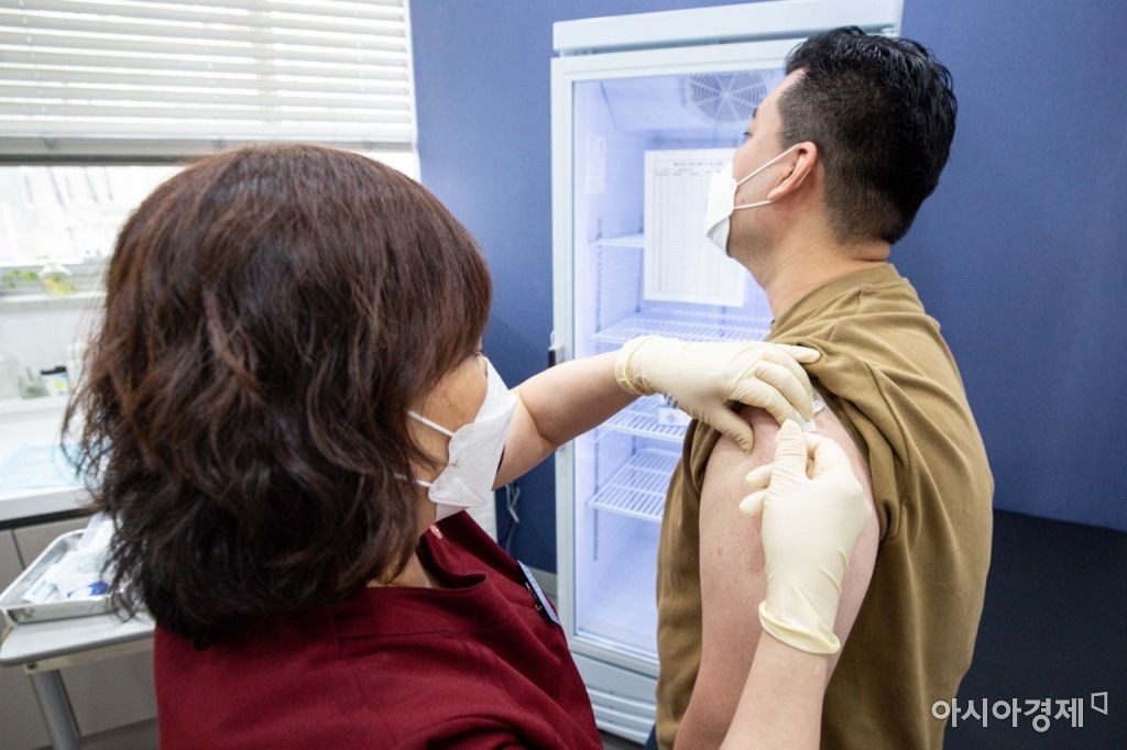 30세 이상 60세 미만 예비군과 민방위대원, 국방-외교 관련자 등에 대한 얀센백신 접종이 시작된 10일 서울 용산구 김내과의원에서 30대 접종대상자가 얀센백신을 접종하고 있다./강진형 기자aymsdream@