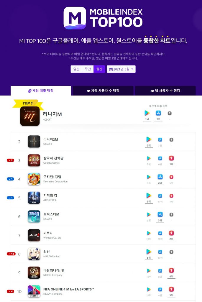 [아시아경제 차민영 기자] 3대 모바일 앱마켓의 게임 랭킹 순위를 발표하는 아이지에이웍스의 빅데이터 분석 솔루션 모바일인덱스에서 매출 기준 5월 모바일 게임 랭킹 차트를 11일 발표했다.