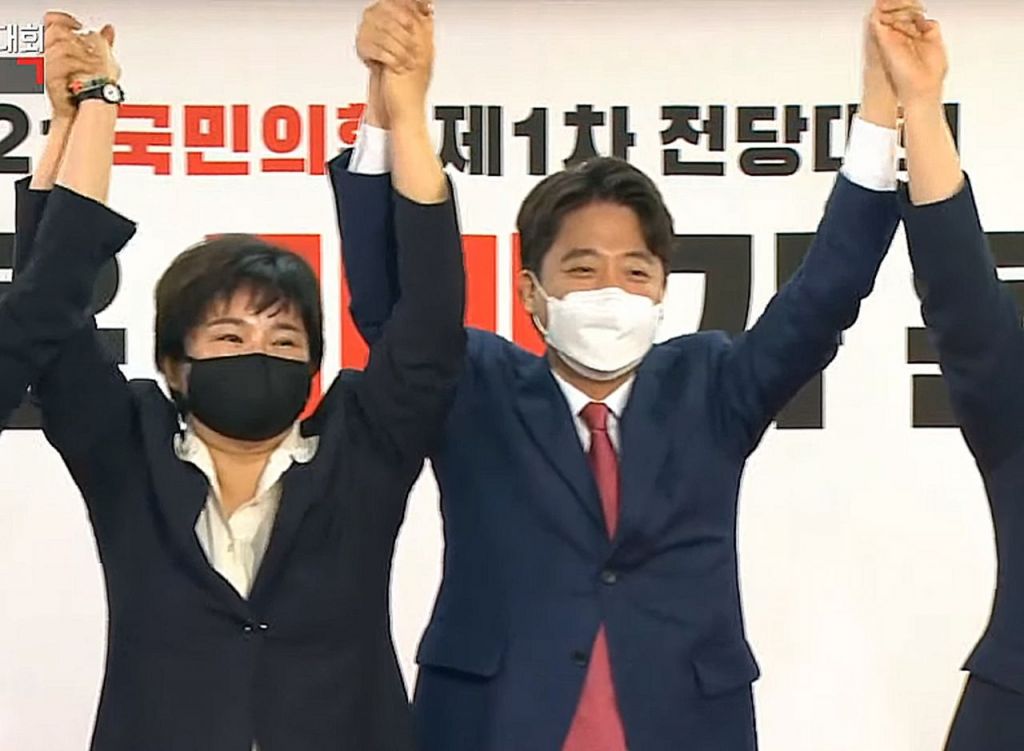 11일 서울 여의도 국민의힘 중앙당사에서 열린 당대표 선출을 위한 전당대회에서 신임 당 대표로 당선된 이준석 후보와 최고위원들이 포즈를 취하고 있다./윤동주 기자 doso7@