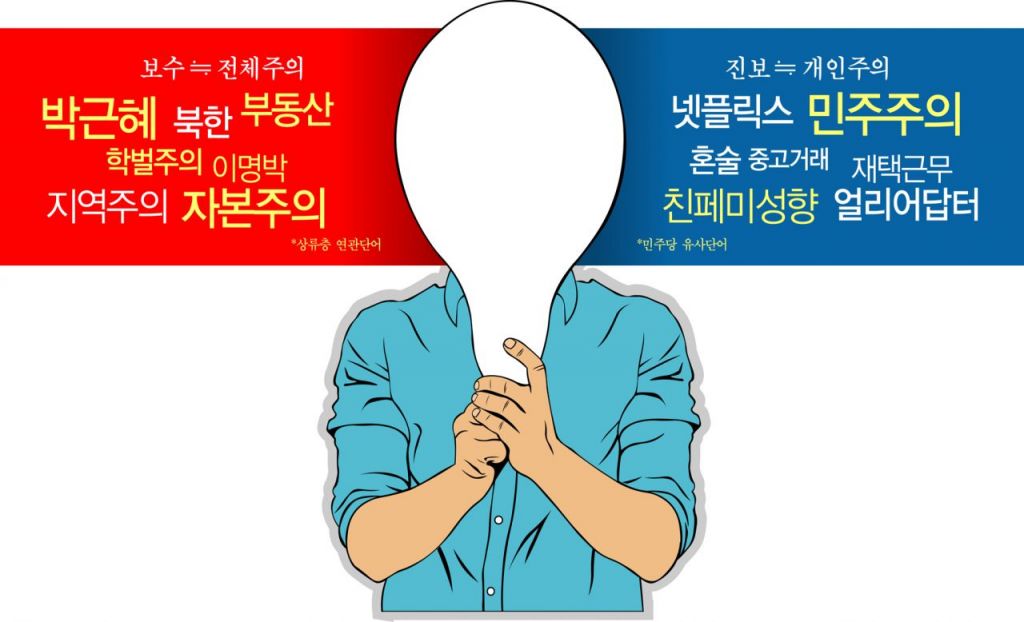 설문조사에서 이념과 관련돼 보수적인 단어로는 '북한' '박근혜' '이명박' '지역주의' '학벌주의' 등 순으로 나타났다. 반면 진보적인 단어는 '넷플릭스' '중고거래' '혼술' '얼리어답터' '재택근무' 등 순으로 조사됐다.