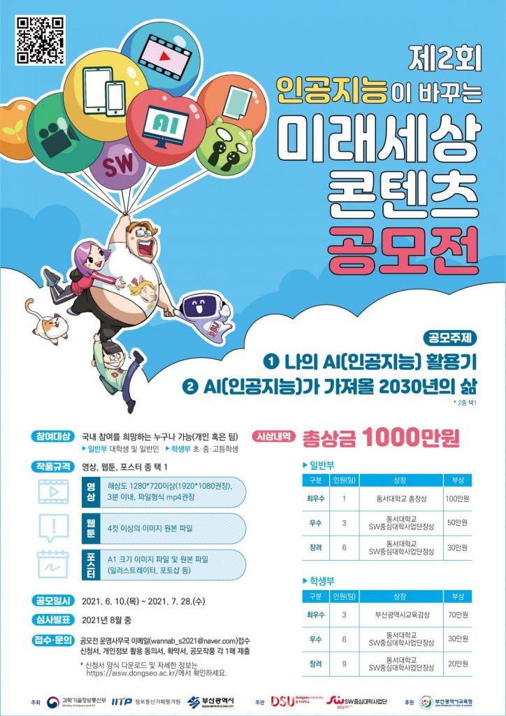 동서대학교(총장 장제국) SW중심대학사업단은 ‘제2회 인공지능이 바꾸는 미래세상 콘텐츠 공모전’을 연다.