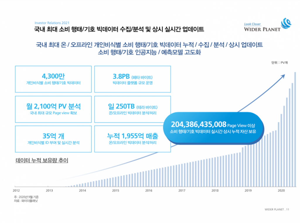와이더플래닛이 제공하는 고객정보, 디지털활동정보, 앱 활동 정보, 단말기 정보와 같은 온라인 행동 데이터는 수년간 누적된 사용자 빅데이터로 정보의 양과 질 면에서 독보적이며, 일단위 방대한 데이터를 수집·분석하고 있어 최신의 데이터 처리 기술을 갖추고 있다. 더불어 수집된 정보를 가공하여 개인 소비행태 및 기호 데이터를 제공함으로써 범용성과 활용성이 높을 것으로 기대된다.