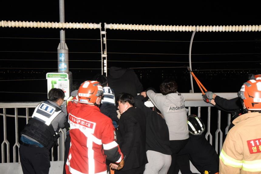 서울 환일고 고등학생 4명이 5월 1일 오전 서울 마포대교 북단 방향 근처에서 20대 남성이 투신하려는 것을 막고 경찰관과 구조를 하고 있다.