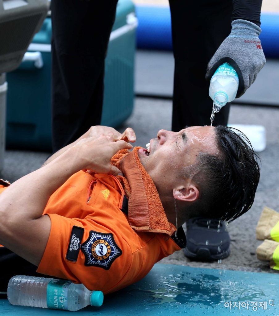 전국적으로 맑고 30도 안팎의 초여름 날씨를 보인 21일 전국소방기술경연대회 출전선수 선발을 위한 ‘2021년 서울소방기술경연대회’가 은평구 서울소방학교에서 열렸다. 대회를 마친 소방관이 아스팔트 바닥에 누운 채 동료 소방관이 뿌려주는 얼음 물을 맞고 있다. /문호남 기자 munonam@