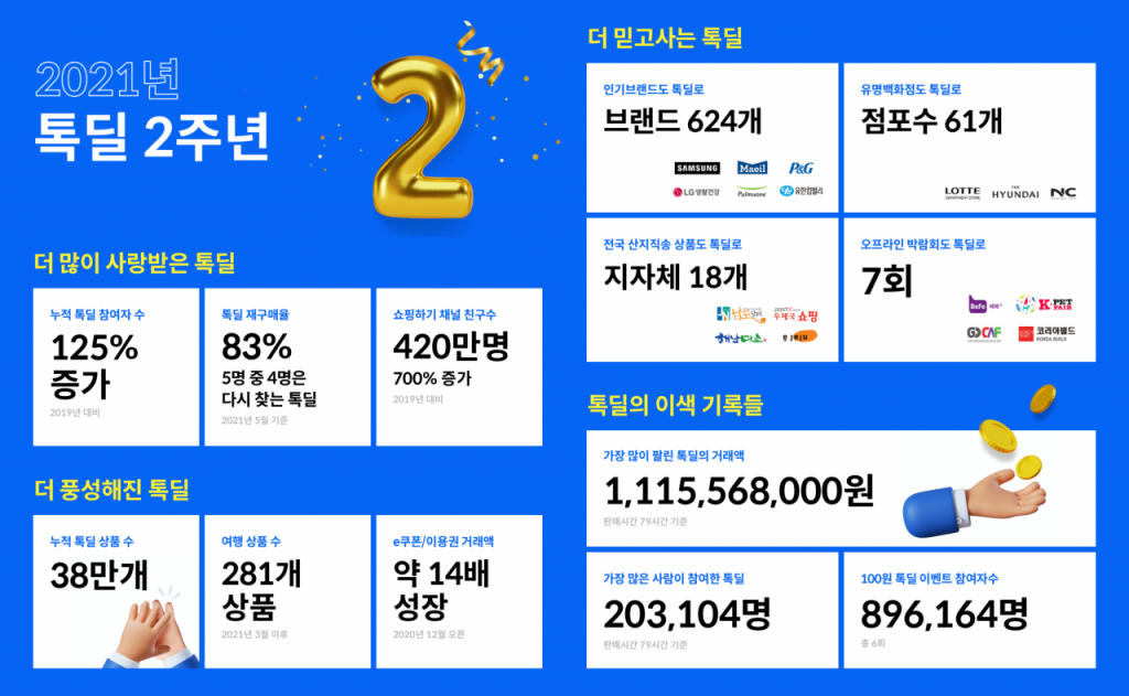 또 누적 톡딜 참여자 수는 19년 대비 125% 증가했으며, 쇼핑하기 카카오톡 채널 친구 수는 19년 대비 700% 증가한 420만명으로 나타났다.