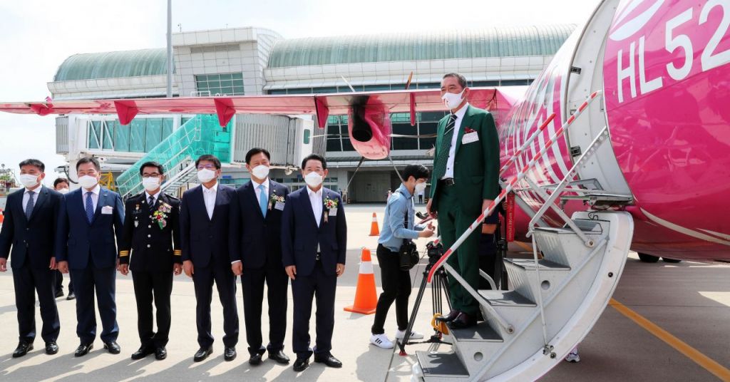 [무안=아시아경제 호남취재본부 윤자민 기자] 전남도는 무안~김포 간 하늘길을 연결하는 ‘하이에어(Hi-Air)’의 신규 노선 취항식이 24일 무안국제공항에서 열렸다고 밝혔다.