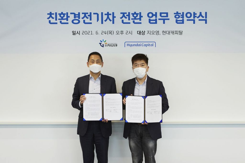 목진원 현대캐피탈 대표(좌측)와 김진태 지오영 사장(우측)은 24일 서울 여의도에 위치한 현대캐피탈 본사에서 친환경 전기차 전환을 위한 업무 협약식을 진행했다.